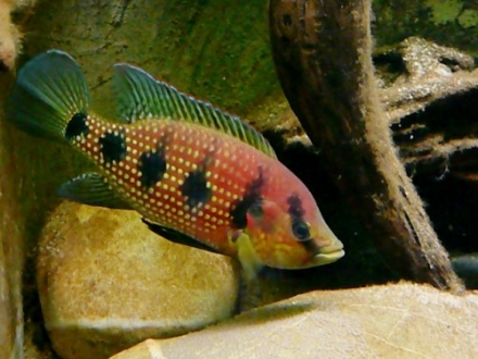 Zie foto's. Hemichromis elongatus heeft een lengte van ongeveer 20cm, waarbij het mannetje iets grover is van bouw. Dit is een van de vijfvlekkenhemichromissen Er zijn nogal wat kleurvarianten van Hemichromis elongatus; van grauw-gekleurde tot roodbruingele vissen.