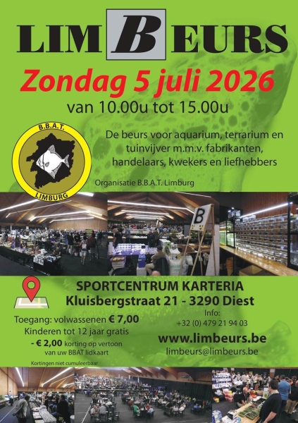 BBAT-LIMBURG, de federatie van aquarium- en terrariumclubs uit Limburg organiseert op zondag 5 juli 2026 de 34ste LIMBEURS. Deze beurs wordt gehouden in SPORTCENTRUM KARTERIA, Kluisbergstraat 21 - 3290 Diest. Tussen 10 en 15 uur is iedereen welkom te kopen, te verkopen, te ruilen of om in de gezellige cafétaria een lekker met elkaar te kletsen over de hobby. Er is ruime parkeergelegenheid voor handen.
